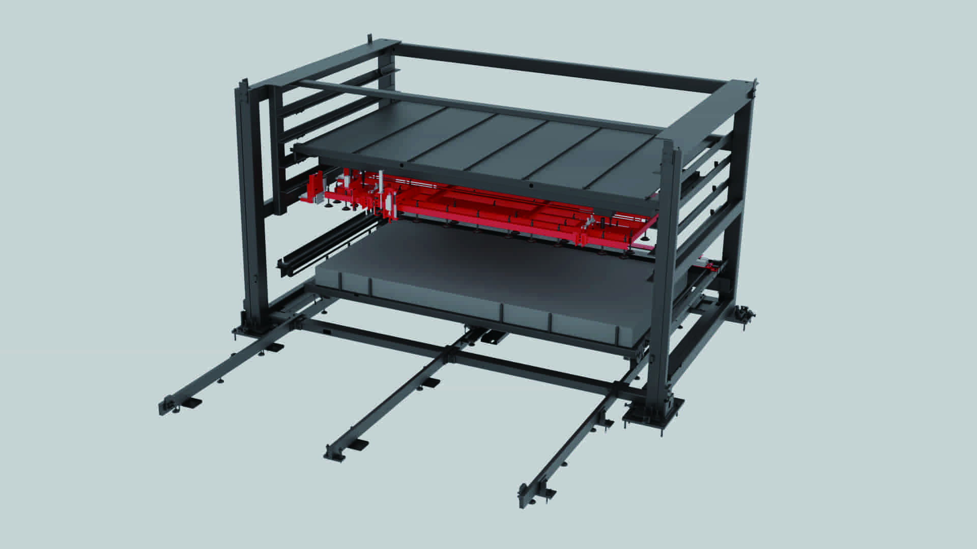 - レーザマシン上部のデッドスペースをパレット格納用ラック(※3)とした省スペース設計