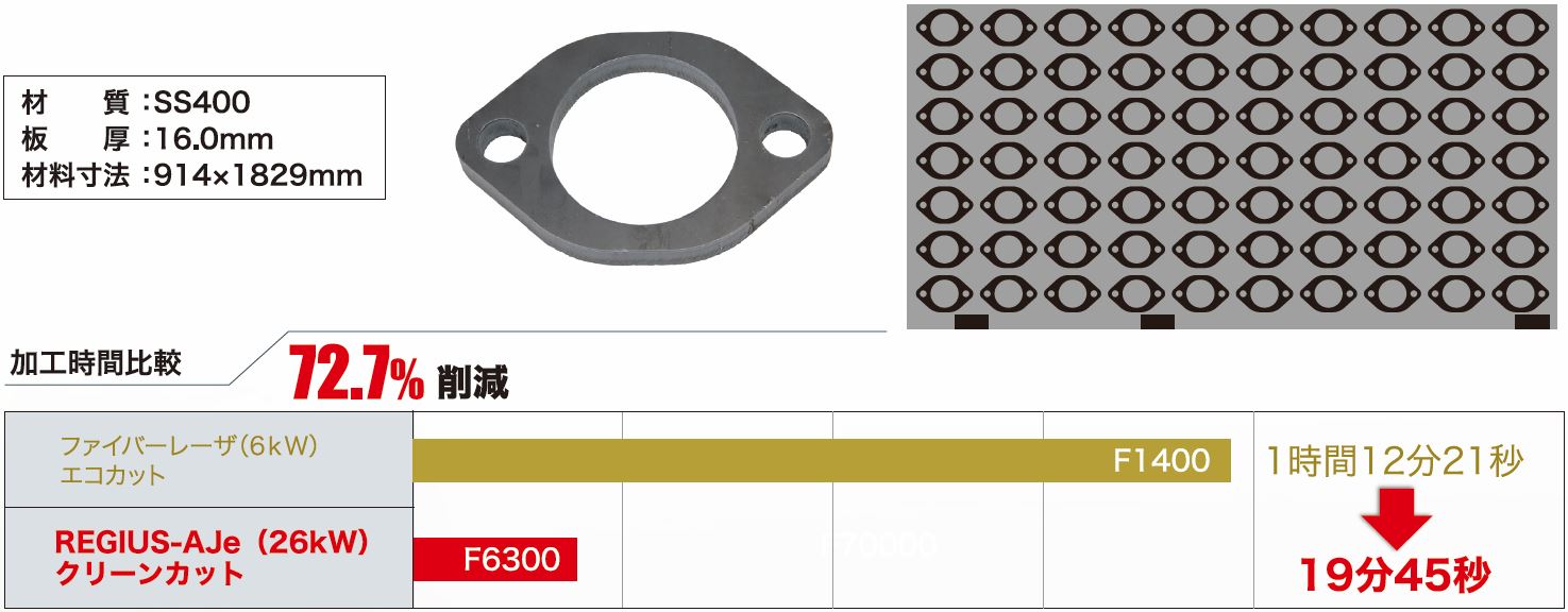 軟鋼 16mm の加工では、ファイバーレーザ 6kW のエコカットと比較して 4.5 倍の加工速度で加工が可能です。