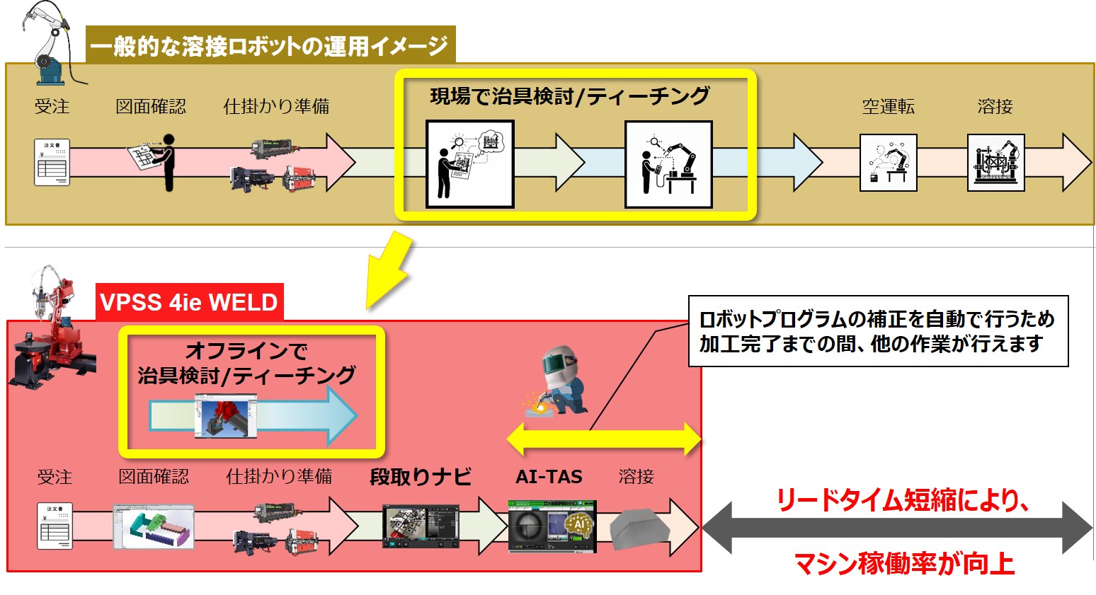 「段取りでロボットが止まる」という現場の課題を解決します。 ファイバーレーザ溶接システム用CAM「VPSS 4ie WELD」により、治具検討やティーチングをオフライン化。段取りに必要な事前準備をPC上で完結できます。 現場では、加工シミュレーション(CAM)や段取り状態を撮影した画像を確認できる「段取りナビ」に従うことで、迷うことなく迅速に段取りが可能です。 さらに、ロボットプログラムの補正をAI-TASが自動で行い、加工完了までを自動化。 現場作業をスムーズにし、溶接開始までの時間を大幅に短縮。ロボットのダウンタイムを削減し、生産性向上を実現します。