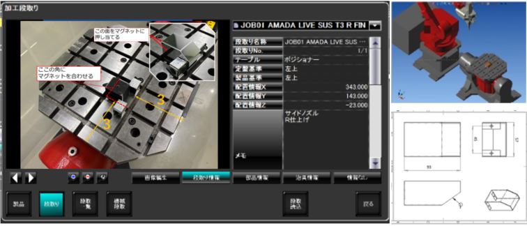 「段取りナビ」で段取り情報をプログラムに紐づけ、NCやロボットモニターから確認できます。間違いのない、スムーズな段取り作業が可能です。