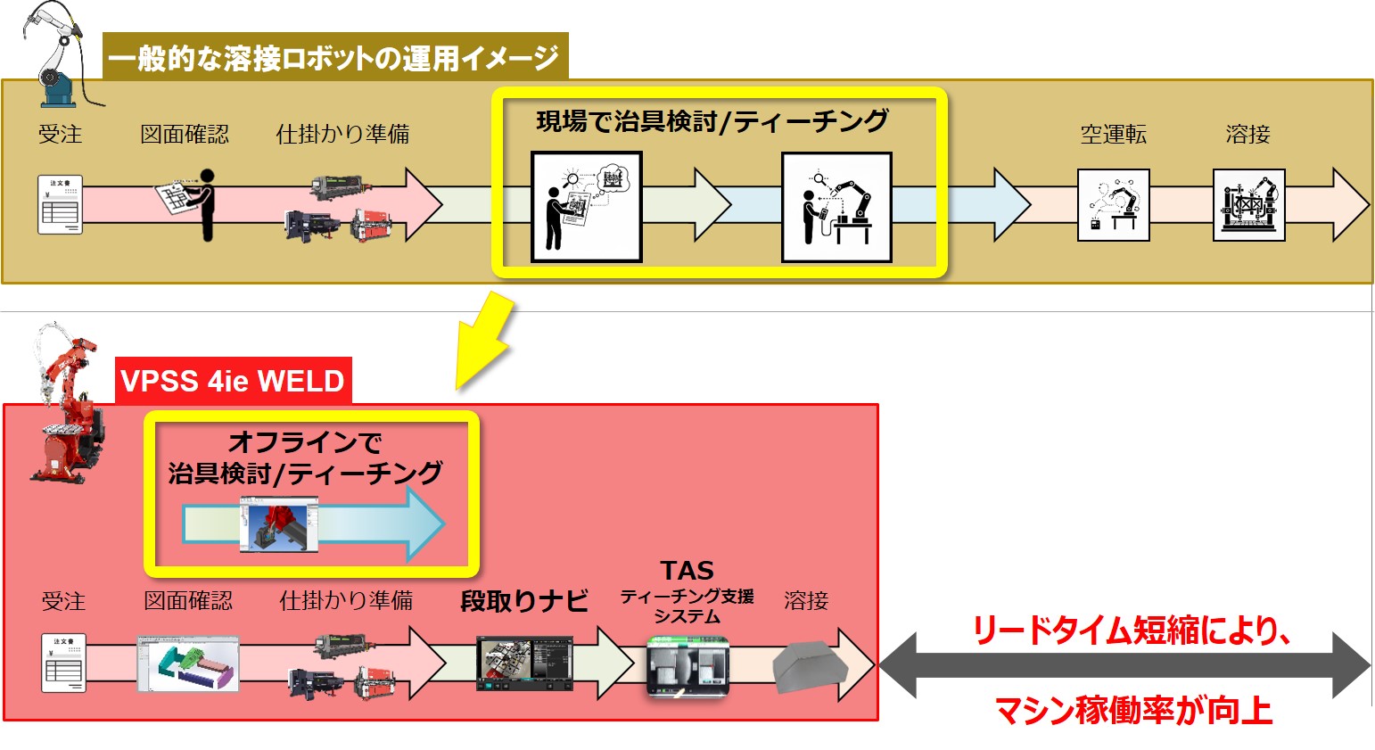 「段取りでロボットが止まる」という現場の課題を解決します。ファイバーレーザ溶接システム用CAM「VPSS 4ie WELD」を使用して治具検討やティーチングをオフライン化。段取りに必要な事前準備をPC上で完結できます。現場では、加工シミュレーション(CAM)や段取り状態を撮影した画像を確認できる「段取りナビ」に従うことで、迷うことなく素早く段取りが可能です。