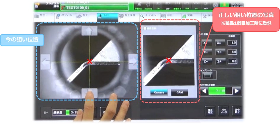 TAS(ティーチング支援システム)を用いることで、NC画面上で補正を行うことができます。画面右側に製品の正しい狙い位置が表示されるため、同じ位置に赤い十字線を動かすだけで簡単に補正ができます。