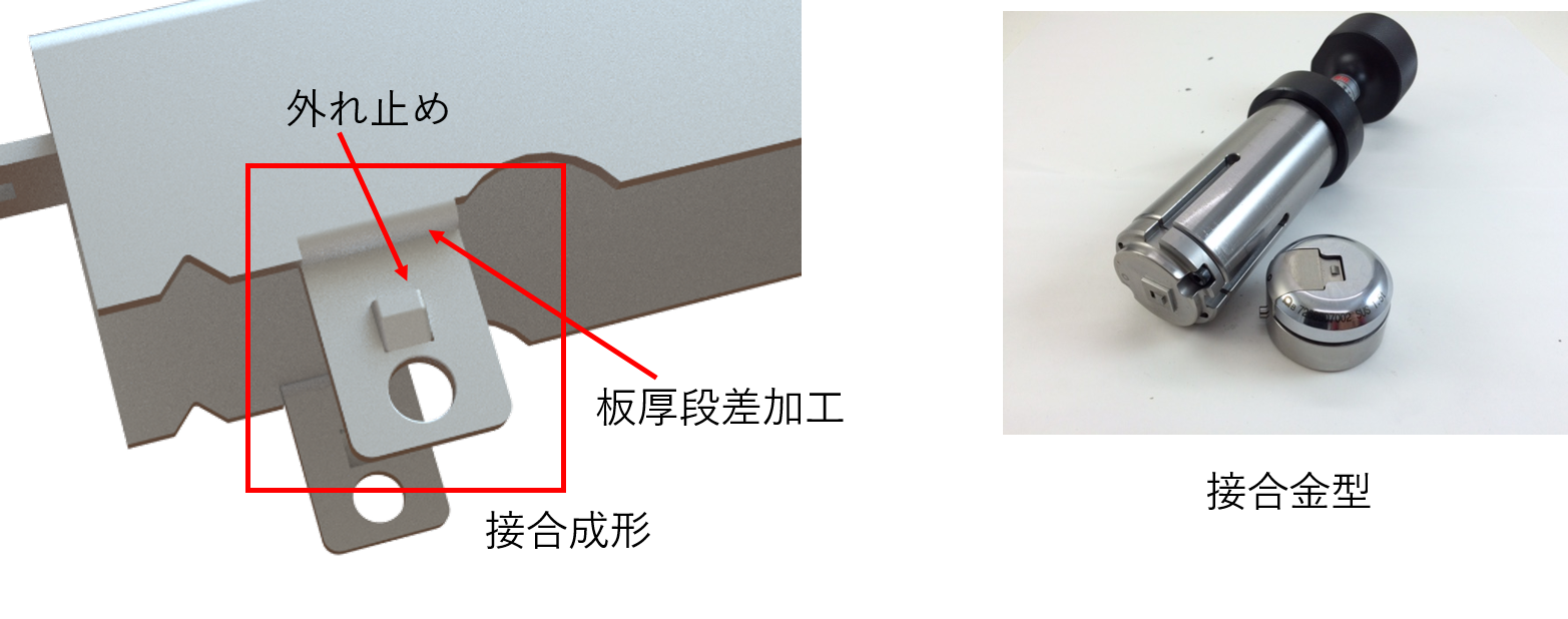 接合金型で板厚段差と外れ止めを同時に加工します。