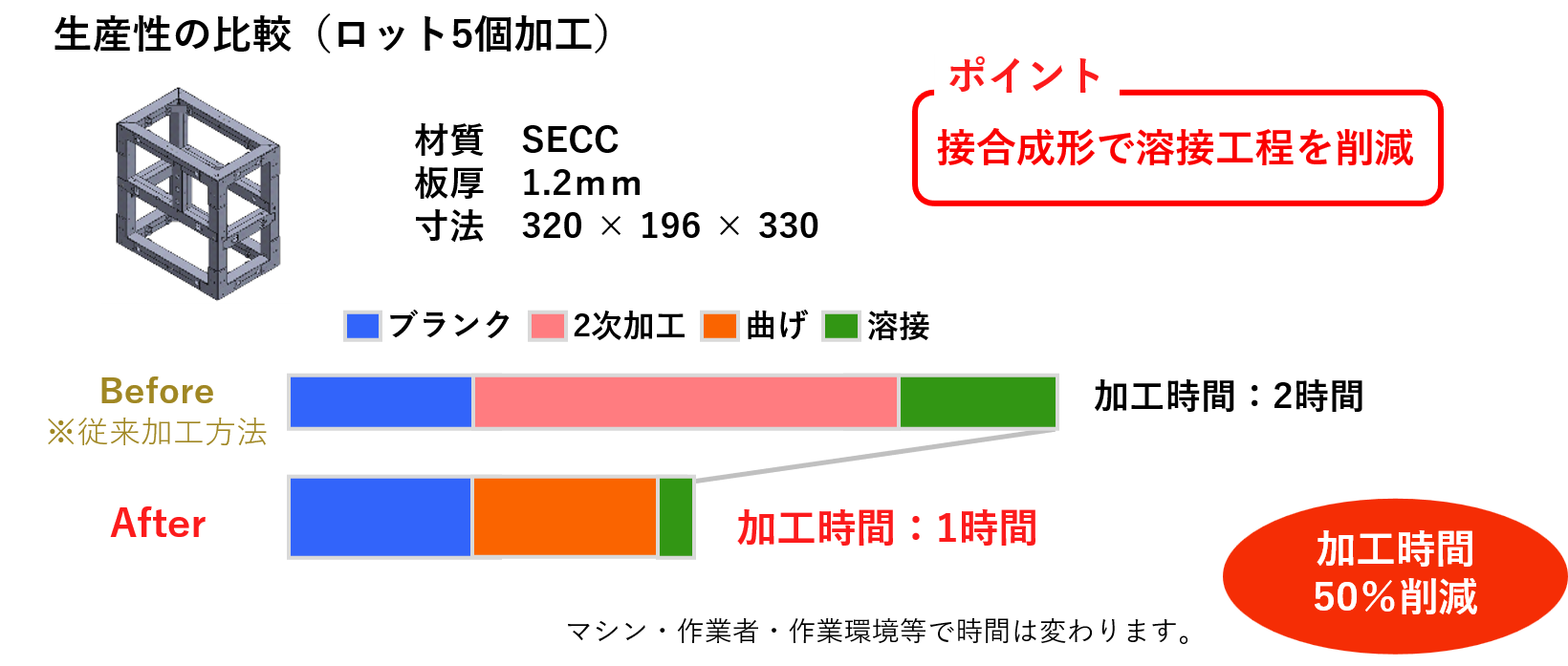 溶接を使わずに接合できるだけでなく、穴明け、成形、タップなどもブランク工程で加工できるので、製造リードタイムを大幅に短縮できます。